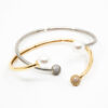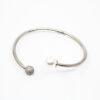 Pulsera plateada estilo Bangle abierta terminada en dos bolas, una de perla y otra de Strass. Se abre fácilmente para poner y quitar sin complicaciones. Un diseño sencillo y elegante.