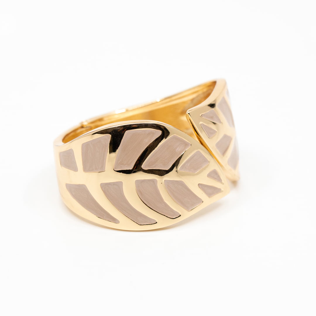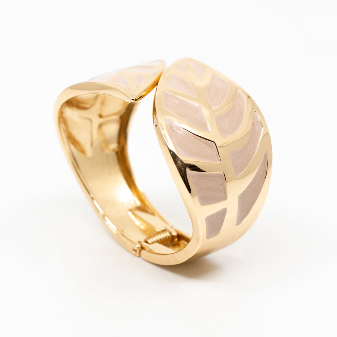 Brazalete en forma de hojas con base dorada efecto espejo y esmalte color beige. Apertura con muelle trasero para poner con total comodidad.