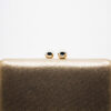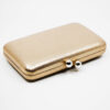 Clutch de fiesta en color dorado con acabado irisado en tono suave y cierre de dos bolas doradas. Incluye cadena. Un diseño elegante que debes tener en tu fondo de armario.
