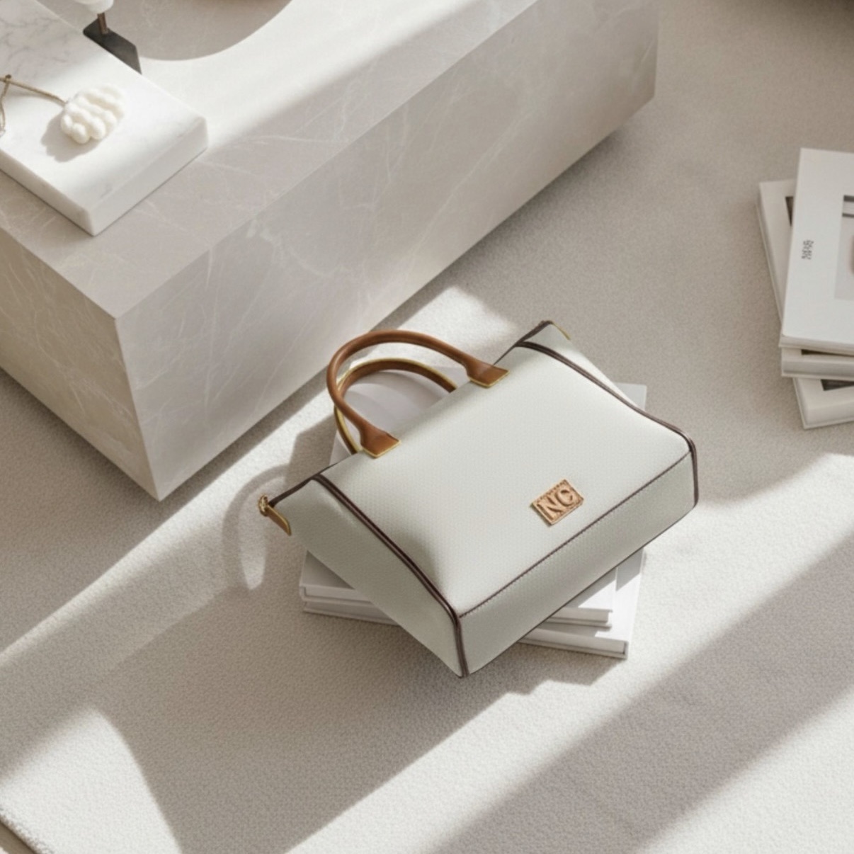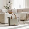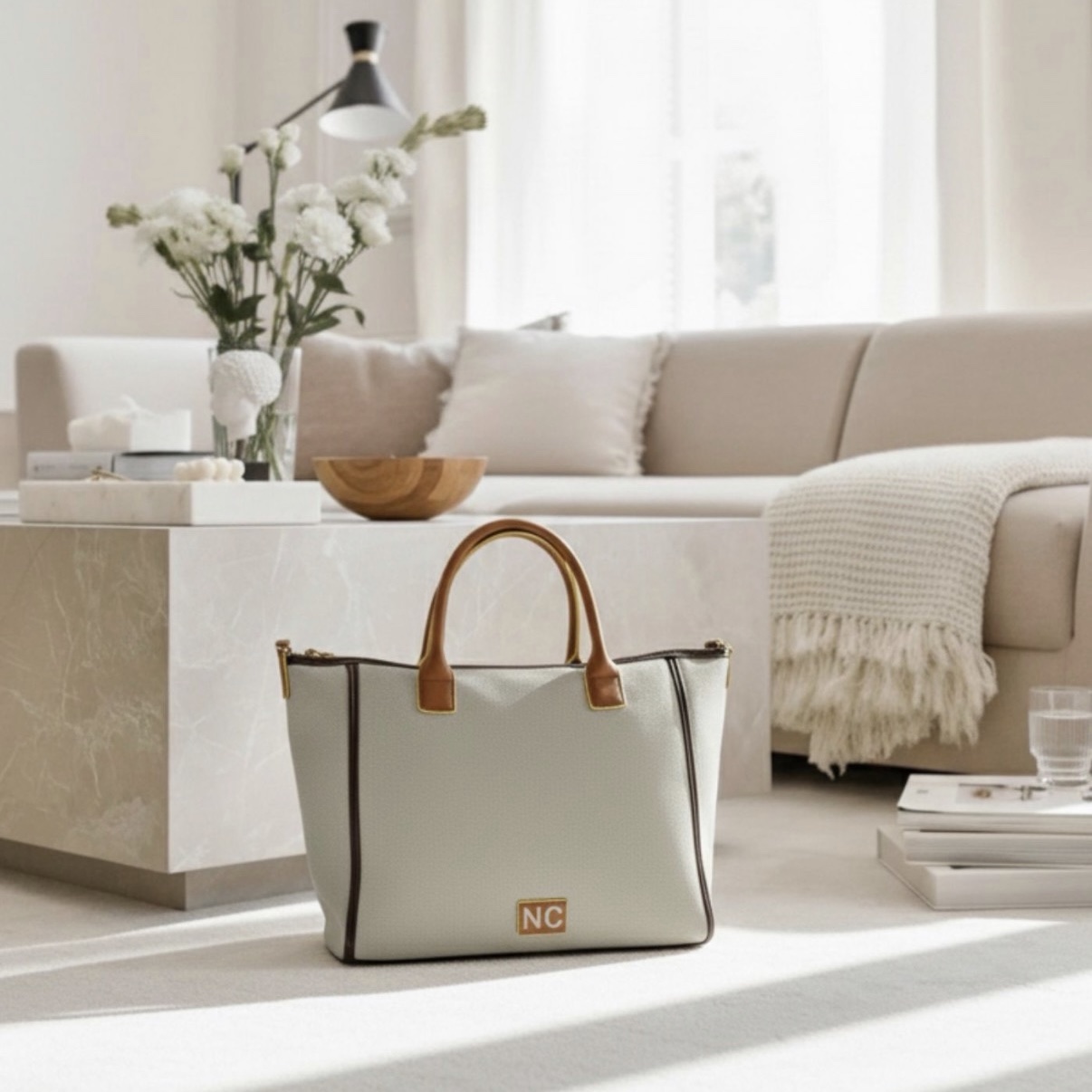 Bolso shopper grande de lona natural beige, diseñado para mujeres que buscan un bolso espacioso, elegante y lleno de detalles. Sus acabados en piel sintética marrón chocolate y camel, junto con los bordes amarillos, aportan un toque especial y sofisticado. Incluye correa ajustable para bandolera.