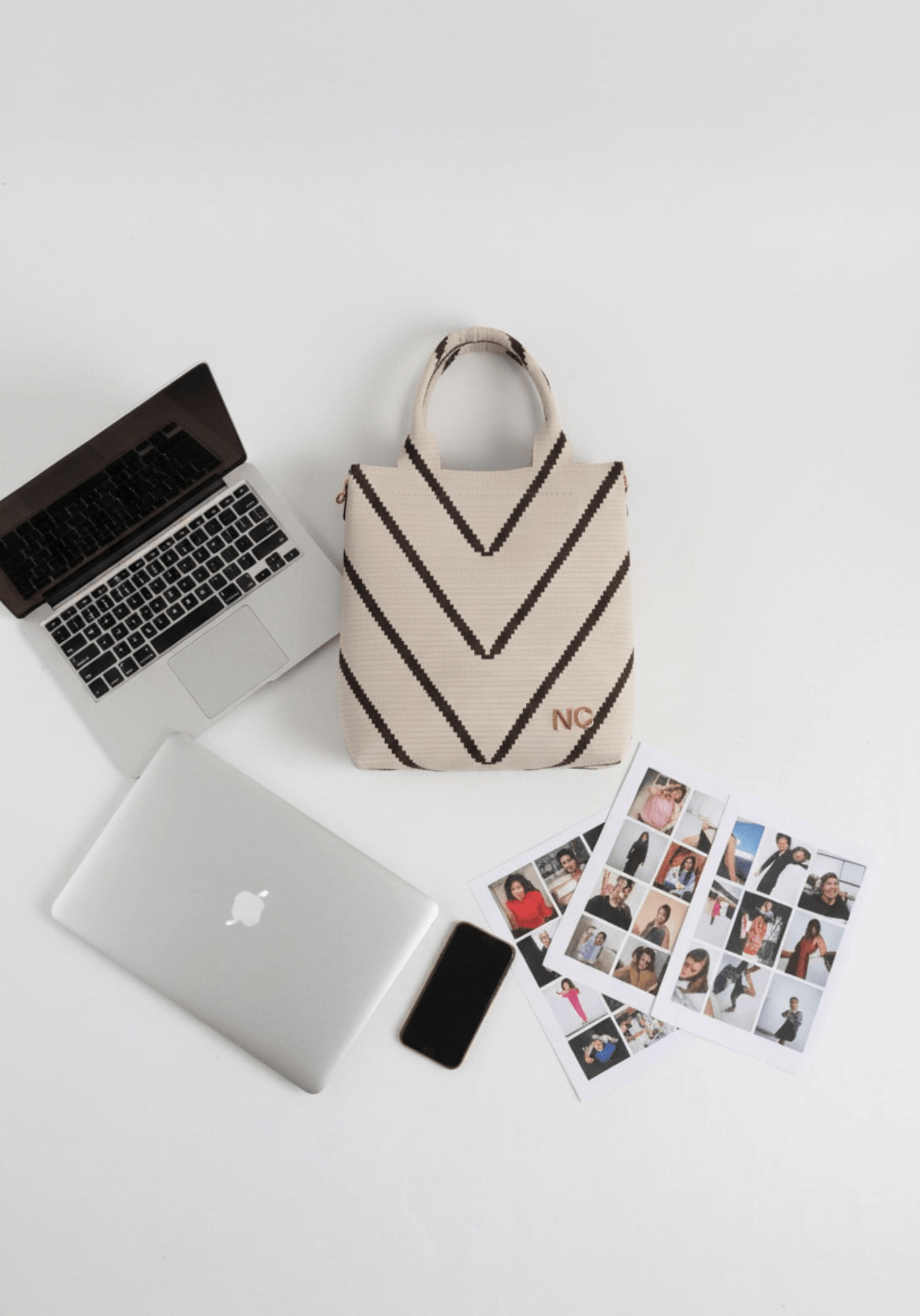 Bolso tote de Noco confeccionado en punto estructurado, con fondo beige y líneas diagonales en contraste en marrón. Incluye correa larga para llevar de bandolera.