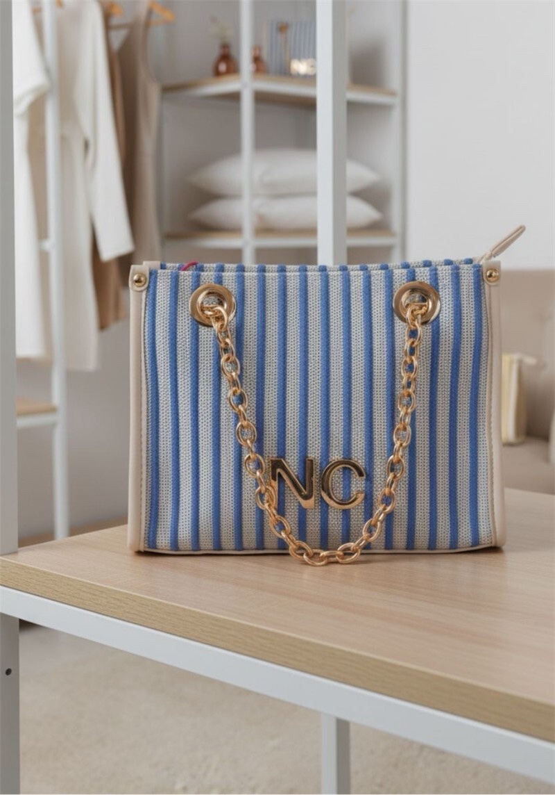 Bolso de Noco con líneas combinadas en azul y crema, doble cadena dorada corta y correa para bandolera de PU.