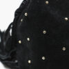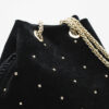 Bolso color negro de estilo bombonera con flecos y tachuelas doradas, tiene cadena regulable dorada para llevar de bandolera o al hombro.