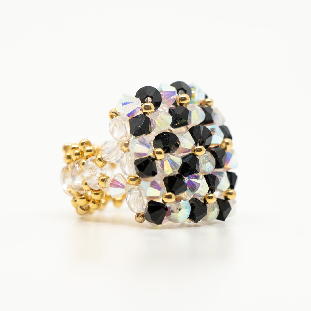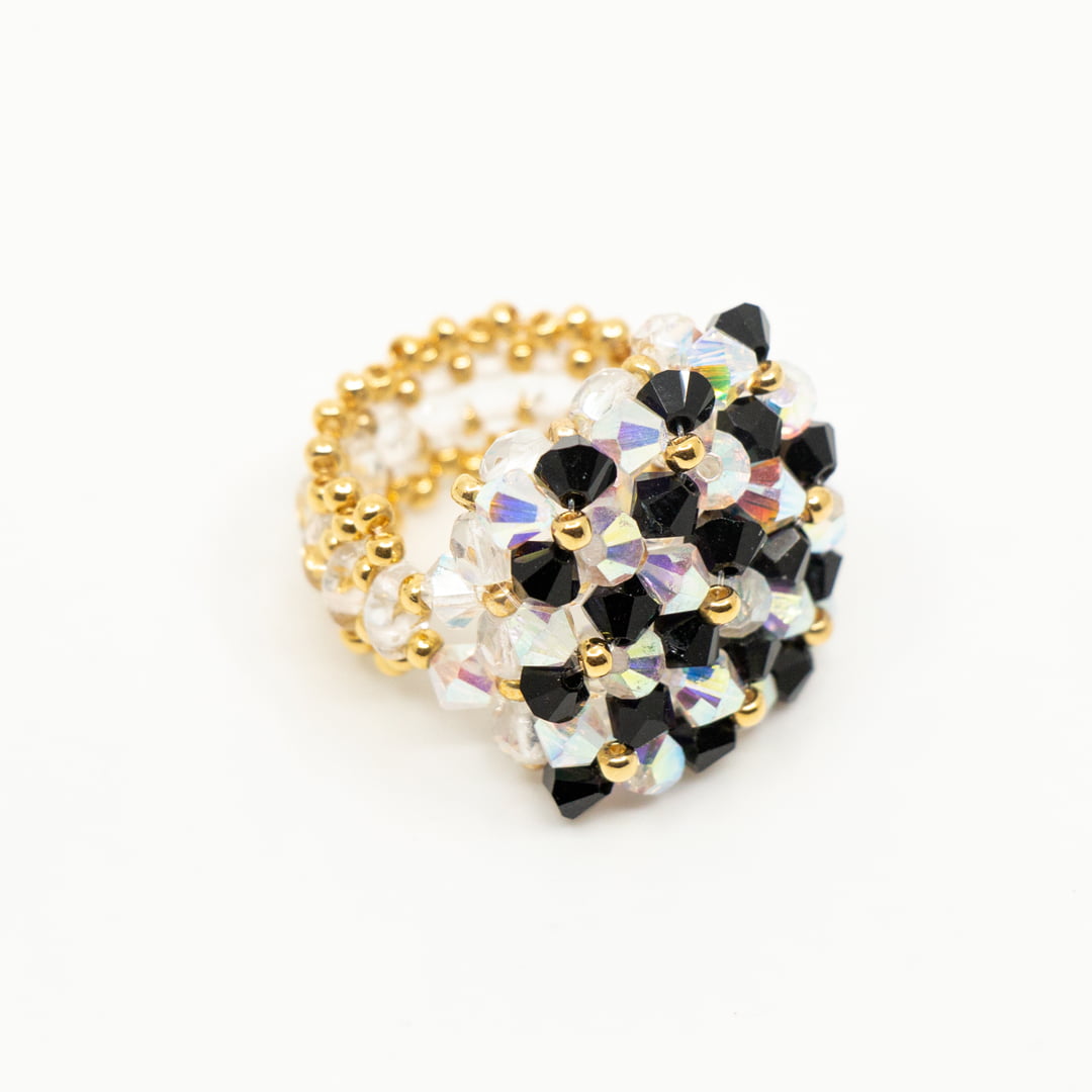 Anillo combinado en blanco y negro hecho a mano con tupi de 4mm de cristal de Swarovski y base elástica, se adapta a cualquier medida.