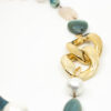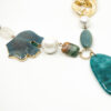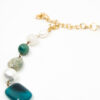 Diseño exclusivo de collar hecho a mano de color verde, con piedras naturales, perla, resina y piezas de metal bañado en oro.