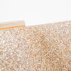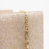 Clutch de fiesta con acabado de purpurina en color dorado. Incluye cadena para llevar al hombro.